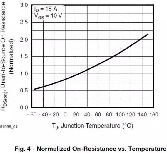 導通電阻的溫度關系:MOS的導通電阻隨溫度上升而上升,下圖顯示該MOS的導通電阻在結溫為140度的時候,為20度時候的2倍。