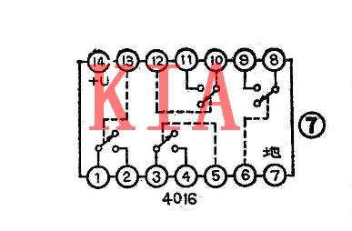 在實際使用中并沒有開關(guān)S1,而是加上一個幅度相當(dāng)于電源(+U)的正脈沖。當(dāng)未加正脈沖時,相當(dāng)于S1接地(低電位)。開關(guān)處于斷開狀態(tài)。當(dāng)正脈沖到來時,相當(dāng)于S1接正電壓(高電位),開關(guān)處于導(dǎo)通狀態(tài)。我們稱圖中的引出腳1和2;3和4;8和9;10和11組成四個CMOS模擬開關(guān)。