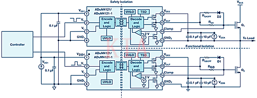 如果驅(qū)動(dòng)電路沒(méi)有用于接地參考的隔離,則將需要大于VBUS 的電壓來(lái)驅(qū)動(dòng)Q1。這是一個(gè)繁瑣的解決方案,對(duì)于高效系統(tǒng)來(lái)說(shuō)并不實(shí)用。因此,人們需要經(jīng)過(guò)電平轉(zhuǎn)換并以高端晶體管源極為基準(zhǔn)的控制信號(hào)。這被稱為功能隔離,可以利用隔離式柵極驅(qū)動(dòng)器(如ADuM4223)來(lái)實(shí)現(xiàn)。