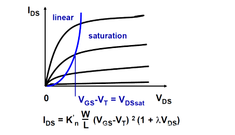 當MOS管進入飽和區后,輸出電流并不是水平線,而是存在一定的傾斜。這是由于導電溝道產生夾斷,有效溝道長度變短。