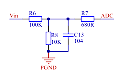 Vin=24V低壓檢測電路,將24V轉換到0-3V3之間,實測效果挺好的,電阻使用1%的精度。